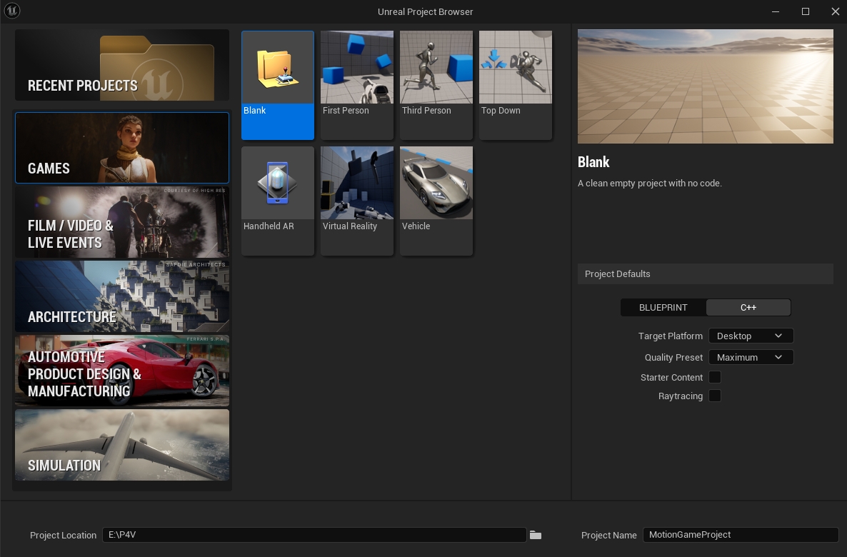 To create a new C++ project in Unreal Engine, open the Unreal Engine Editor and select Games -> Blank, and then C++ in the project defaults so it looks as shown below: