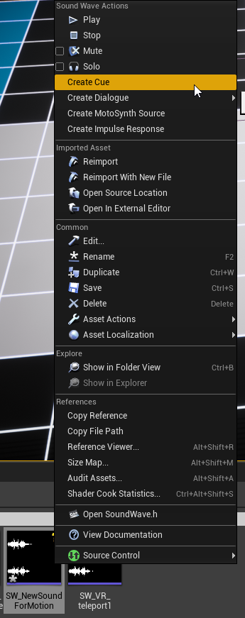 To create a Sound Cue, right-click a Sound Wave and select Create Cue.