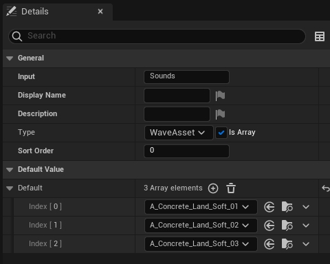On the left-hand side, in the Details tab, you will find the Sounds array which holds all the sound cues that are used in this Meta Sound Source. Add your newly created sound cue to the array to have it in the list of randomly chosen sounds for this sound source.