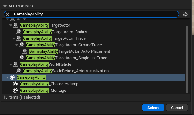Let's start by implementing a simple Dash ability. To do so, create a new blueprint with the Gameplay Ability parent class.