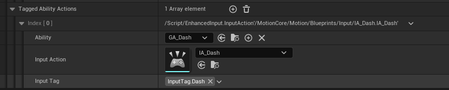 Open your MotionInputConfig (Default: Plugins/MotionCore/Content/Motion/Blueprints/Input/IC_Default ) and add your ability under the Tagged Ability Actions array.