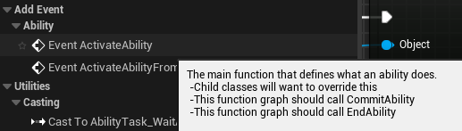 For the sake of this tutorial, we are only going to implement the ActivateAbility event, which gets called once you've triggered the input for the ability that we will set up later.