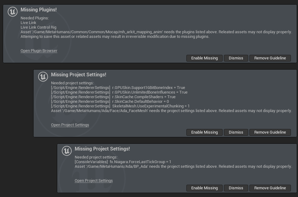 Make sure to modify your project settings when prompted by confirming dialog boxes that show up upon first importing a Metahuman into your project and then restart Unreal Engine.