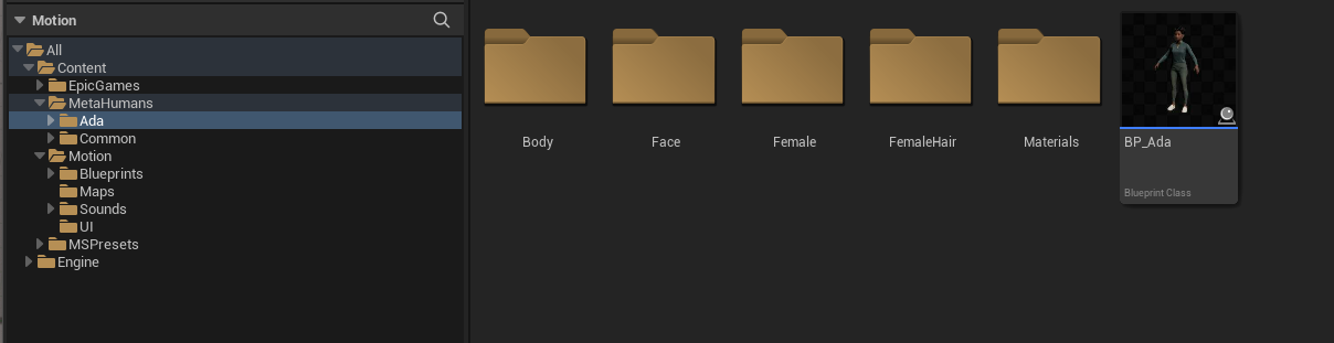 Once successfully imported, you'll find your Metahuman, alongside other common assets used by Metahumans in your project.